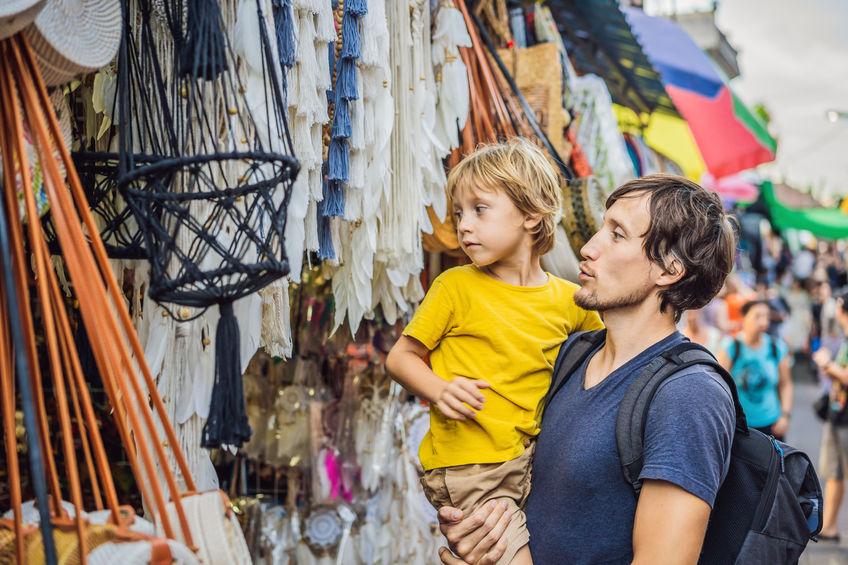 Dad and son at a market in Ubud, Bali. Typical souvenir shop selling souvenirs and handicrafts of Bali at the famous Ubud Market, Indonesia. Balinese market. Souvenirs of wood and crafts of local residents. Traveling with children concept. Kids friendly place.