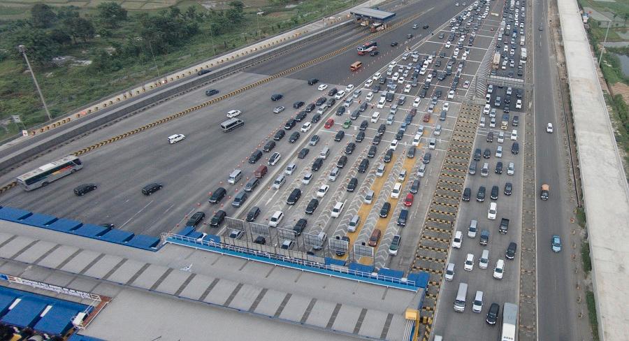 Foto aerial mobil mengantre di gerbang tol Cikarang Utama pada H+3 Lebaran, Bekasi, Jawa Barat, Sabtu (9/7). PT Jasa Marga membuka 21 gerbang tol dan berencana menggratiskan tarif tol jika antrean kendaraan mencapai 5 km. ANTARA FOTO/Rosa Panggabean/aww/16.