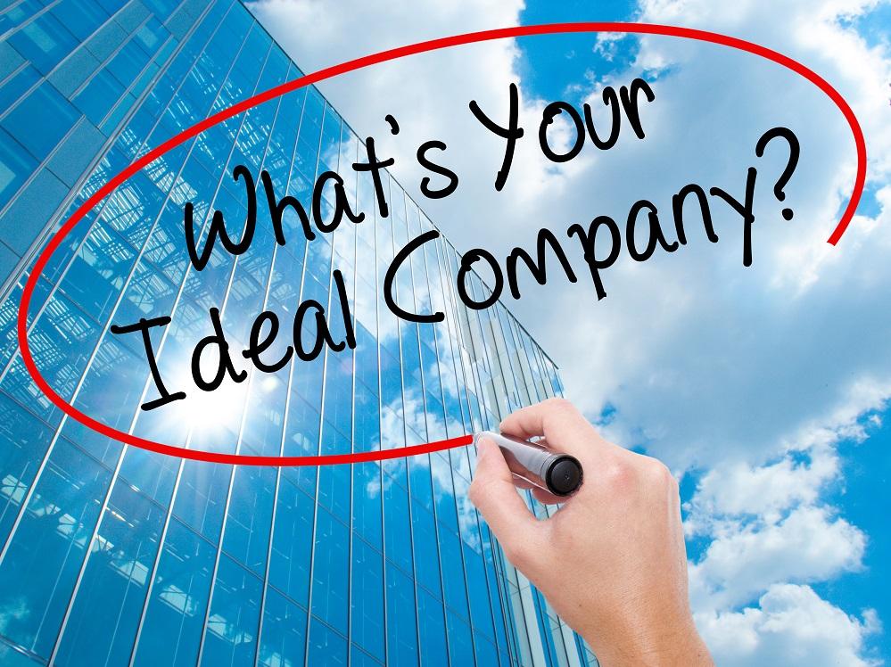 Man Hand writing Whats Your Ideal Company? with black marker on visual screen. Business, technology, internet concept. Modern business skyscrapers background. Stock Photo