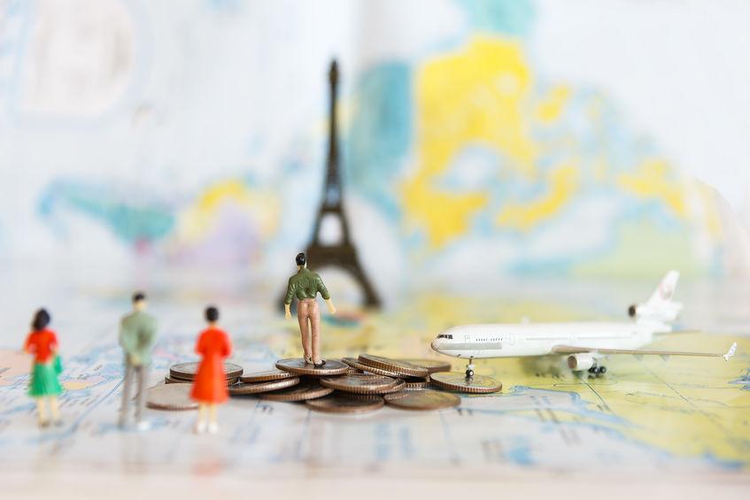 Miniature people with traveling concepts. Group of backpackers walking on passport with stamps. Concept of traveling or exploring the world, budget travel