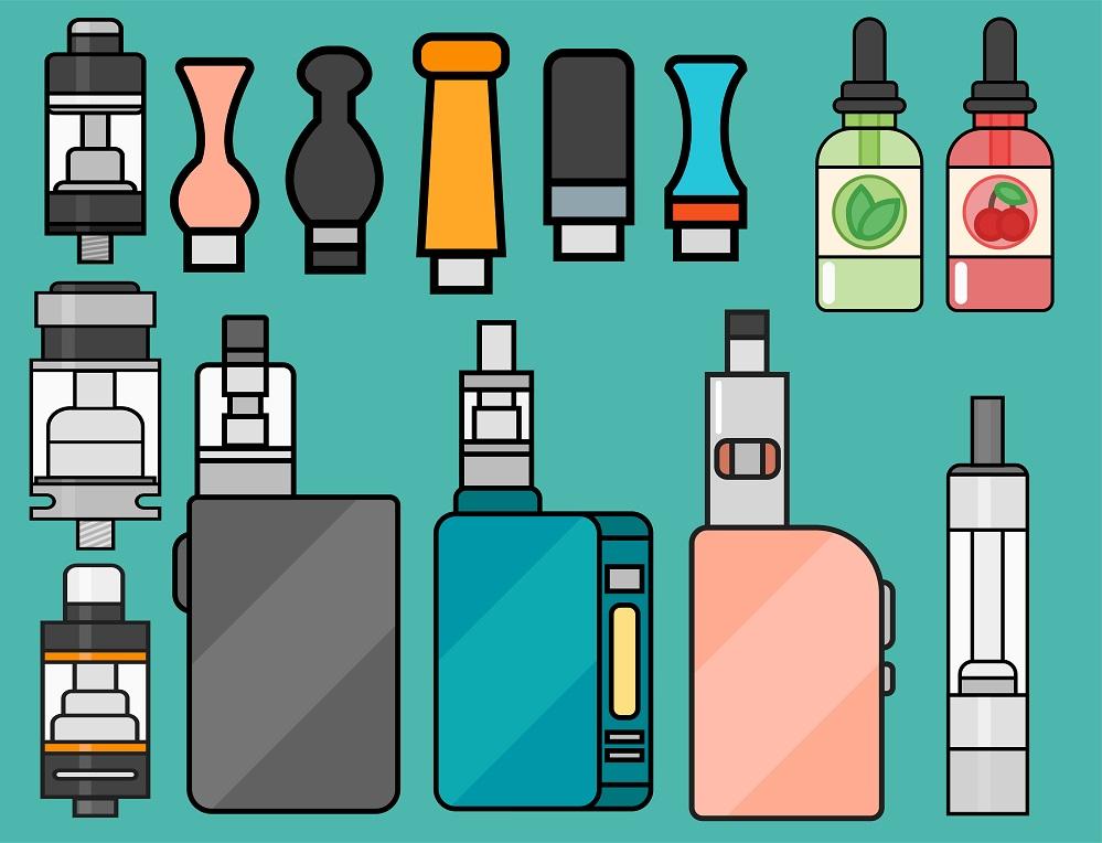 Vape device vector set cigarette vaporizer vapor juice vape bottle flavor illustration battery coil. Trend new culture electronic nicotine liquid. Smoking atomizer device e-liquid.