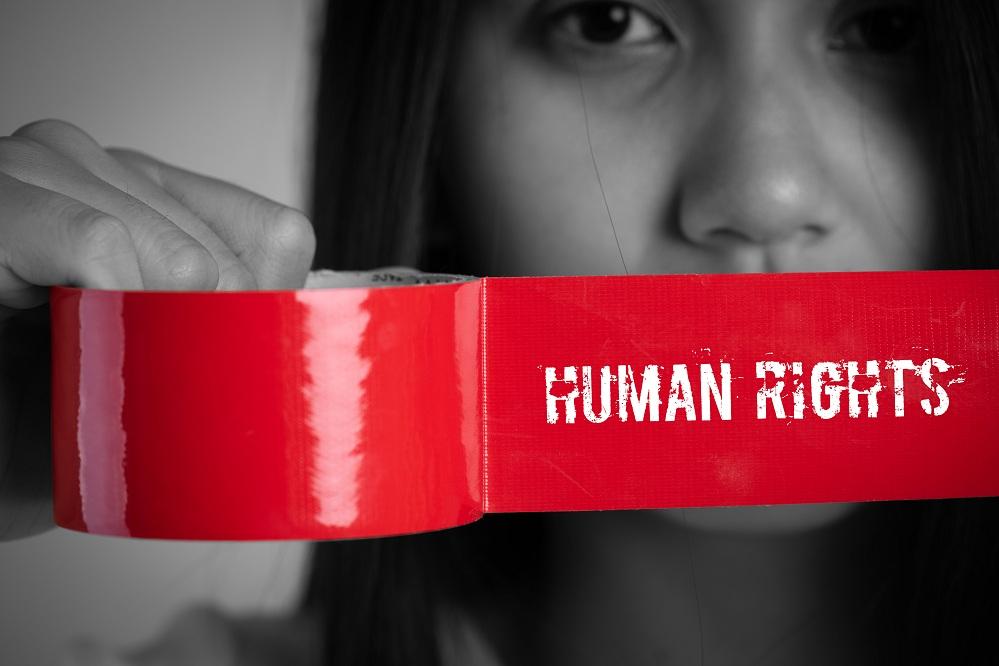 Young woman was wrapping her mount by adhesive tape, Concept freedom of speech, censorship, freedom of press. International Human Rights day.